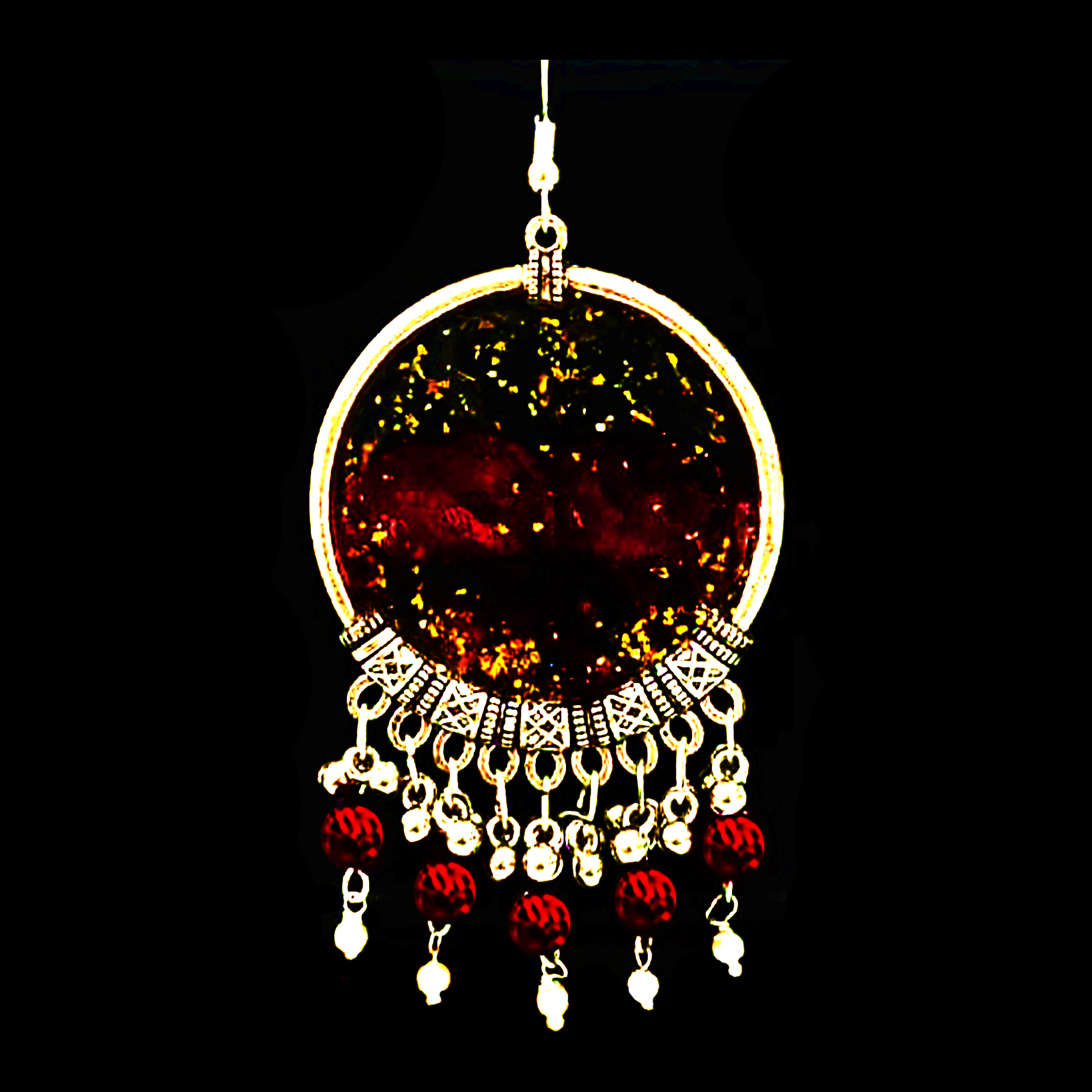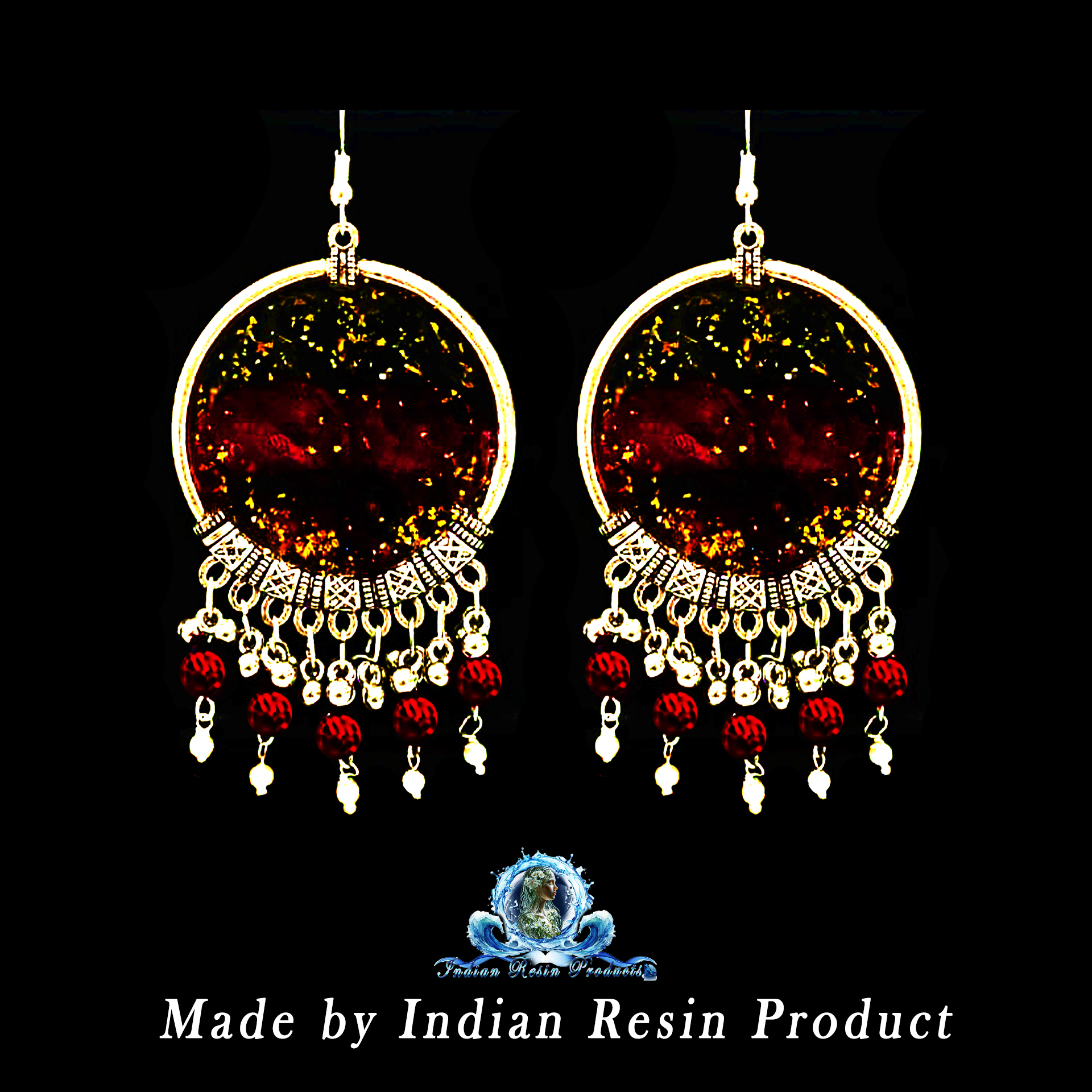 These beautiful handmade red and golden resin earrings are a perfect blend of elegance and artistry. Crafted carefully by Indian Resin Product, each earring is designed with a rich round resin base filled with golden flakes that shine beautifully when they catch the light. The delicate metallic details hanging below the resin piece add a charming traditional touch, making them ideal for both ethnic and modern outfits. These earrings are not just accessories but expressions of creativity and passion that reflect the craftsmanship of Indian artisans.