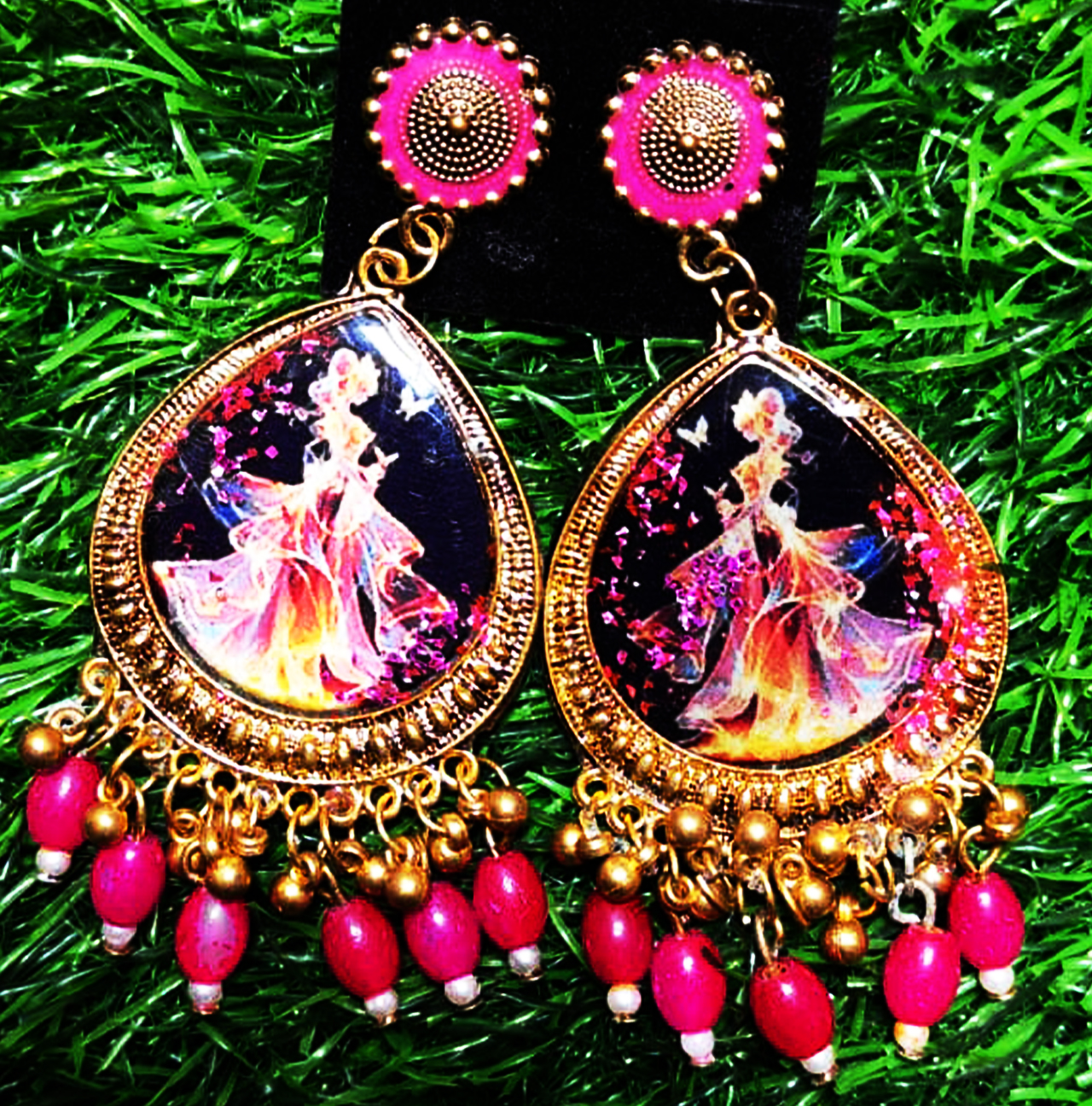 These Handmade Resin Princess Art Earrings are a blend of creativity and tradition. The intricate princess artwork inside a glossy resin finish gives them a royal and artistic touch. Surrounded by a detailed gold-plated border and pink beads, these earrings add elegance to any outfit. Lightweight, durable, and eye-catching — they’re perfect for weddings, festive occasions, or casual outings.